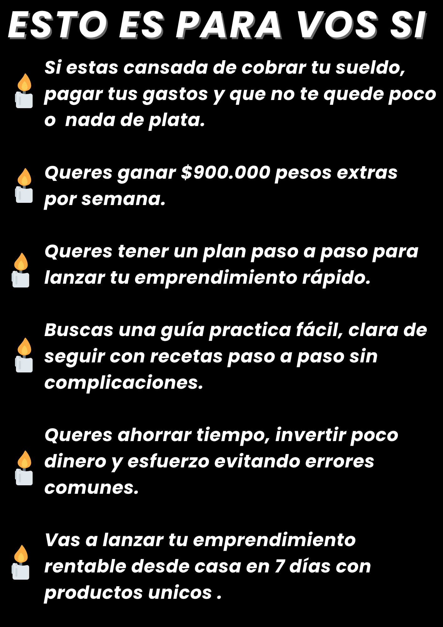 ★★★★★“Monté mi negocio en dos días gracias a las guías. Mis velas decorativas y jabones se agotan rápido. $1.100.000 semanales y creciendo.”